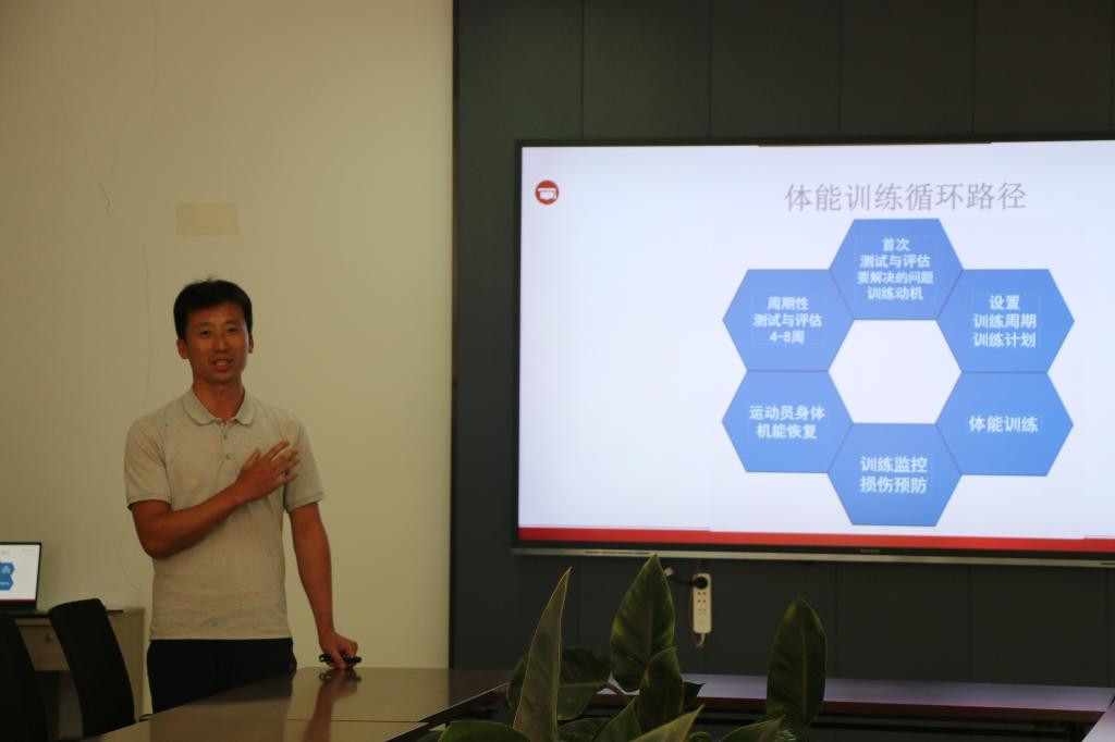 在本次体育学科联合教研中,由威海四中分管体育工作的副校长张华超主持会议,体育部门教师与运动队学生代表等出席,会上邱海业老师通过PPT的方式重点介绍了《体能训练的要素与设计》,体能训练是一种通过有计划、有组织的运动活动,提高人体运动能力、增强身体素质的过程,为了达到最佳的训练效果,邱老师根据学生的身体状况和训练水平指导学生设定合适的训练负荷,保证学生能够在安全的前提下获得最佳的训练效果。
