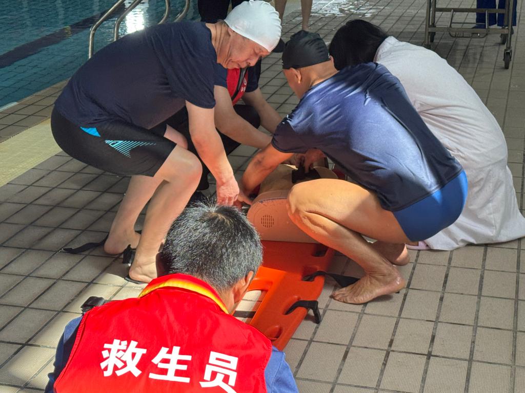 尖锐的哨声划破泳池上空,演练正式拉开序幕。模拟场景中,一名“泳客”在深水区突发剧烈挣扎,呈现典型溺水体征。现场指挥组立即启动应急预案,救生员以鱼跃式入水直抵目标区域,灵活运用侧泳技术绕至溺水者侧后方,采用标准化“托腋拖带法”实施救援。与此同时,辅助组迅速清理泳道障碍,通过救生杆与浮力装置构建快速救援通道,确保施救过程零延误。