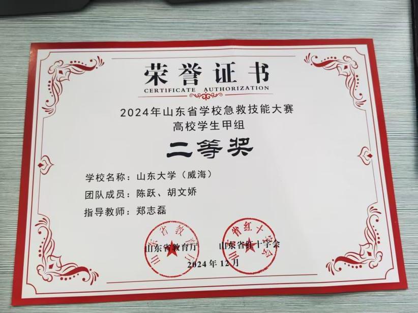 往期优秀学员2023级本科生陈跃和胡文娇同学,在体育学院郑志磊老师的指导下,参加2024年山东省教育厅举办的学校急救技能大赛,以扎实的救护技能功底斩获团体二等奖,为学校争得荣誉。他们以赛场表现生动诠释了“学以致用”的培训理念,其事迹在校园内引发广泛关注,激励更多学生主动加入救护技能学习行列,营造“人人懂急救,安全有保障”的校园氛围。