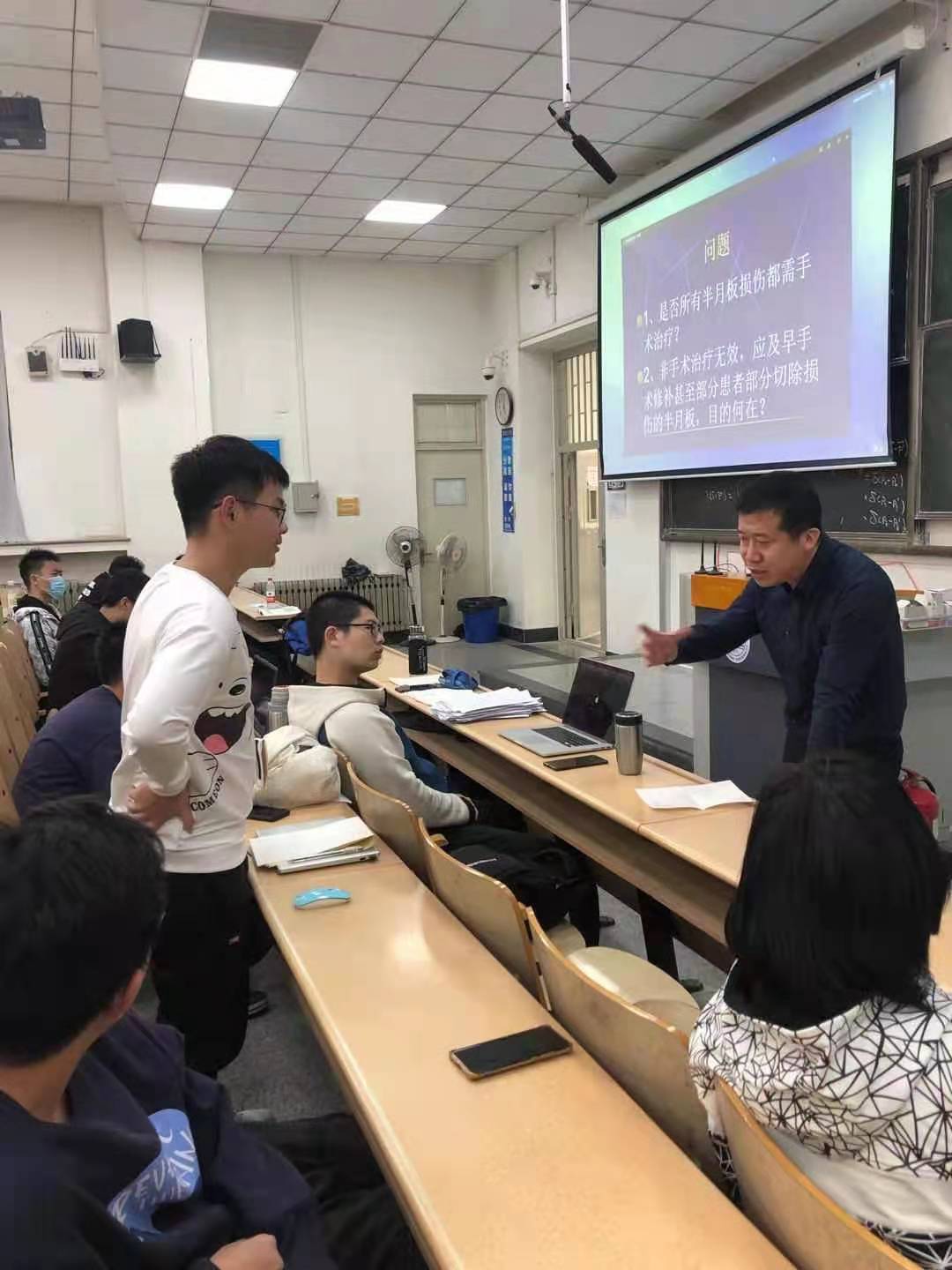 在运动系统损伤预防、运动性猝死与心肺复苏主题报告中,刘博医生对腰肌劳损、半月板损伤等常见的运动损伤和康复进行了讲解,并提出在日常生活中预防运动损伤的有效建议。尤其针对运动性猝死,刘医生从特征、病因等几个方面进行了介绍,并利用医疗道具对于心肺复苏进行了现场教学,邀请学生上台亲身尝试。